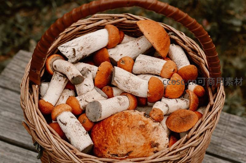 一个质朴的藤编篮子里堆满了刚采摘的牛肝菌,橙色的菌盖和洁白的菌柄上还沾着泥土,展现出秋日山野收获的丰盛与自然气息。