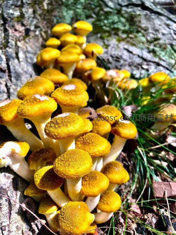 在粗壮树根旁,一簇簇金黄色的蘑菇沐浴在温暖的阳光下,菌盖饱满油亮,与周围的绿草和树皮形成鲜明对比,充满盎然生机。