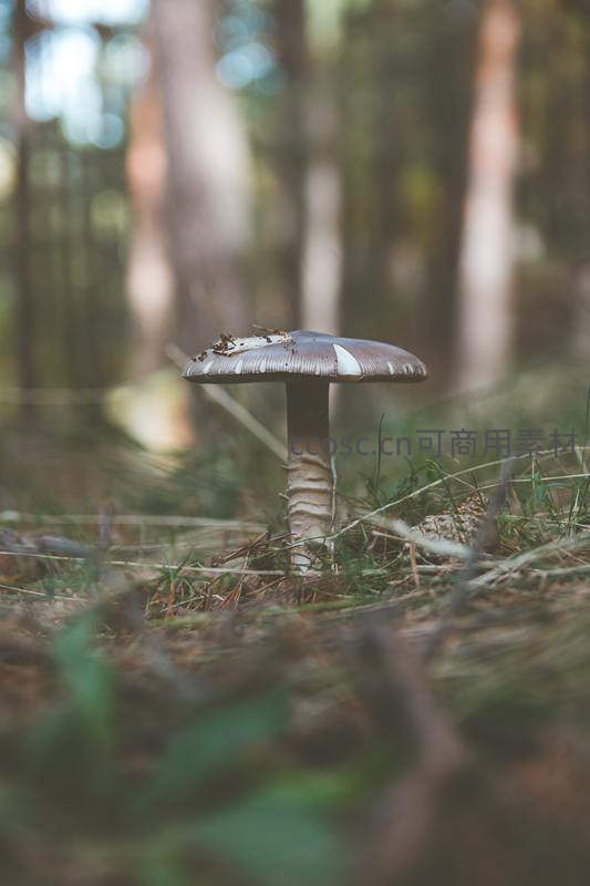 在幽静的森林地面,一株褐色蘑菇独立生长,菌盖边缘略带白色,周围散落枯枝落叶,背景虚化突出主体,传递自然静谧之美。
