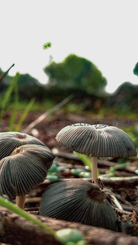 林间地面上几朵灰色褶皱的蘑菇群