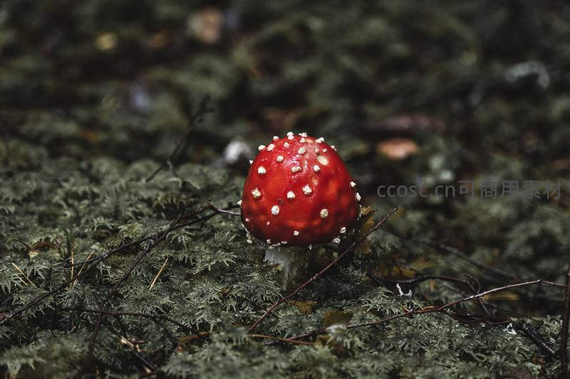 红伞白点林间菌,苔藓深处显奇姿