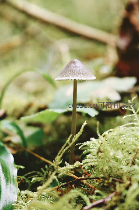 一株小巧的蘑菇在茂密苔藓丛中亭亭玉立,柔和光线勾勒其轮廓,背景绿意朦胧,传递出森林深处的宁静与诗意。