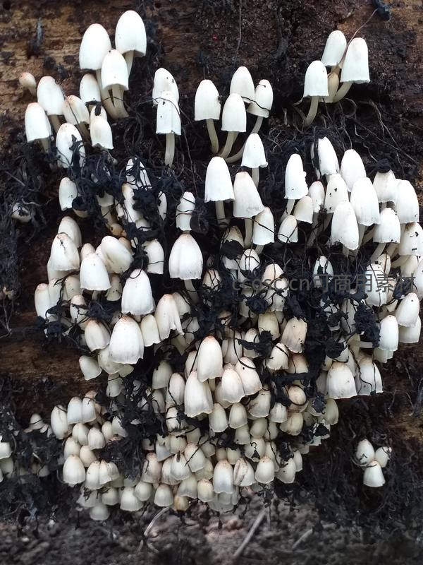 大量洁白细小的蘑菇密集覆盖在腐烂木头上,与黑色菌丝交织,形成强烈的视觉对比,展现了自然界分解与再生的奇妙过程。