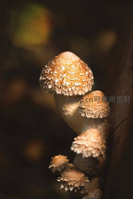 几朵伞状蘑菇沐浴在温暖的斜射光线下,菌盖表面鳞片纹理清晰可见,深色背景衬托出其立体感与自然之美。