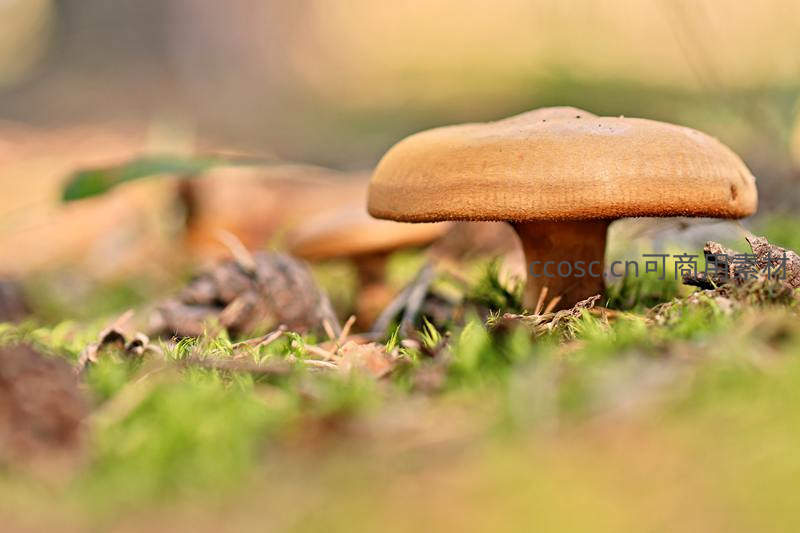 在湿润的森林地表,一株棕色蘑菇从翠绿苔藓中探出,背景虚化营造宁静氛围,展现大自然的细腻与生机。