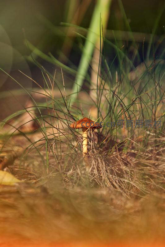 一株小巧蘑菇藏身于细长草叶之间,柔和光线洒落其上,突出其精致形态,传递出野外探索的静谧与惊喜。