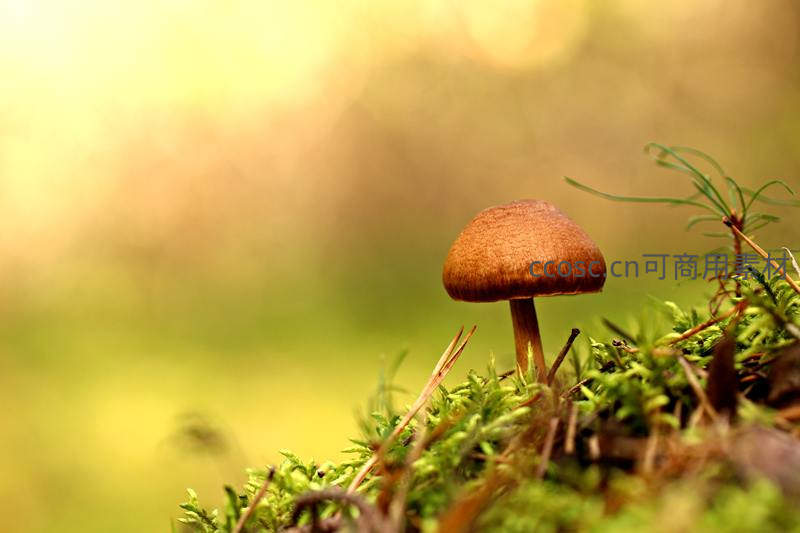 柔和的金色阳光洒落在一株棕色小蘑菇上,它静静立于翠绿苔藓之间,画面温暖而治愈,充满森林的诗意与生机。