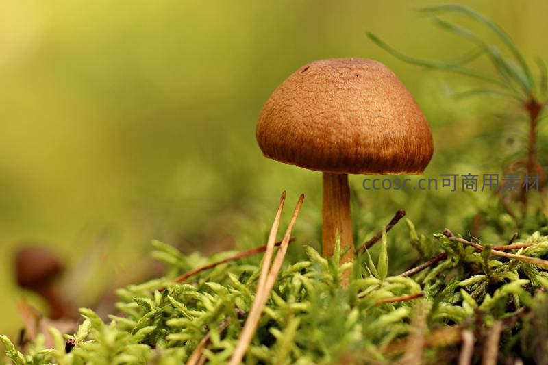 一颗饱满的棕色蘑菇从鲜绿苔藓中拔地而起,细腻纹理清晰可见,周围散落细枝松针,展现森林地面生态系统的微观魅力。
