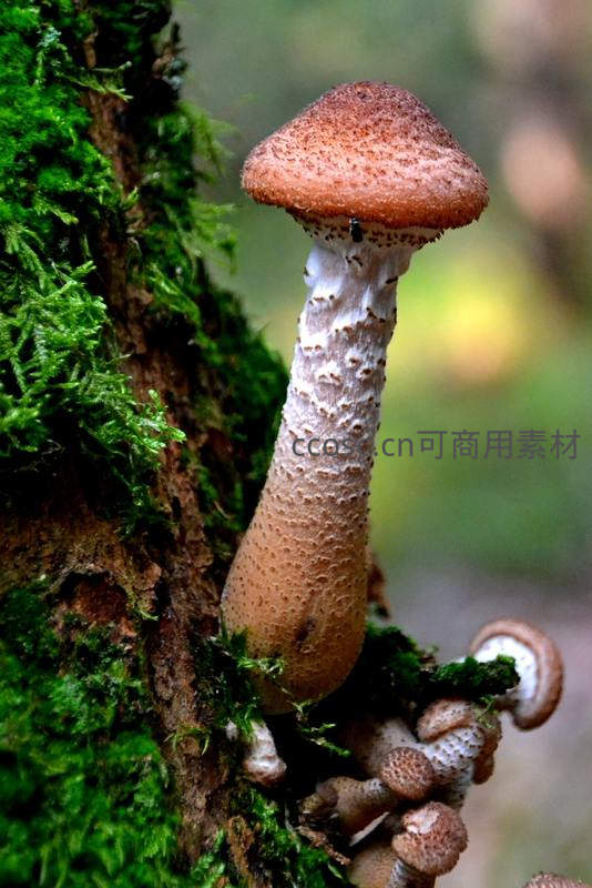 一株菌盖呈棕褐色、菌柄布满细小凸点的蘑菇从青苔覆盖的树干上探出,背景朦胧,凸显其独特纹理与自然之美。