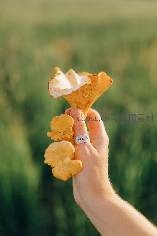 温暖阳光下,手掌轻托几朵形态优美的金黄色鸡油菌,背景是朦胧的绿色田野,传递收获的喜悦与食材的天然质感。