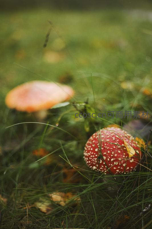 在绿意盎然的草地上,鲜艳的红白毒蝇伞静静绽放,背景虚化突出主体,展现自然生态中神秘而美丽的真菌世界。