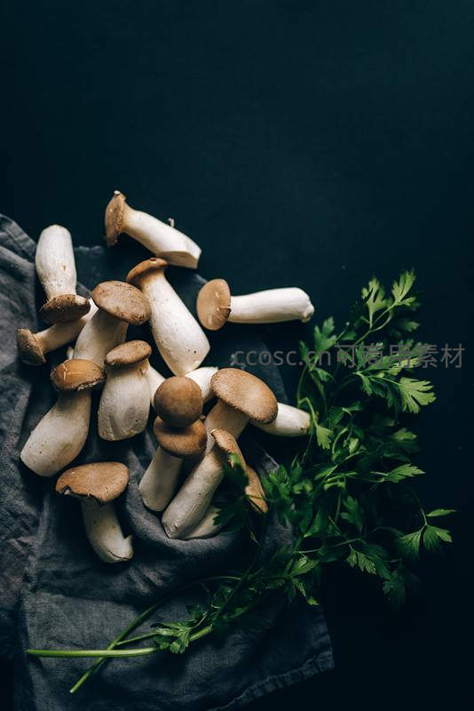 一堆洁白饱满的杏鲍菇置于深色布巾上,旁配翠绿香菜,色彩对比强烈,凸显食材新鲜度与自然风味,适合健康饮食主题。