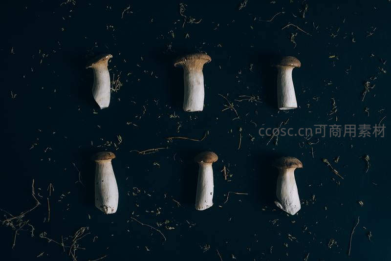 六颗形态一致的杏鲍菇在深蓝色背景上呈两排整齐摆放,周围散落细碎干草,构图对称简约,体现现代极简美学与食材本真。