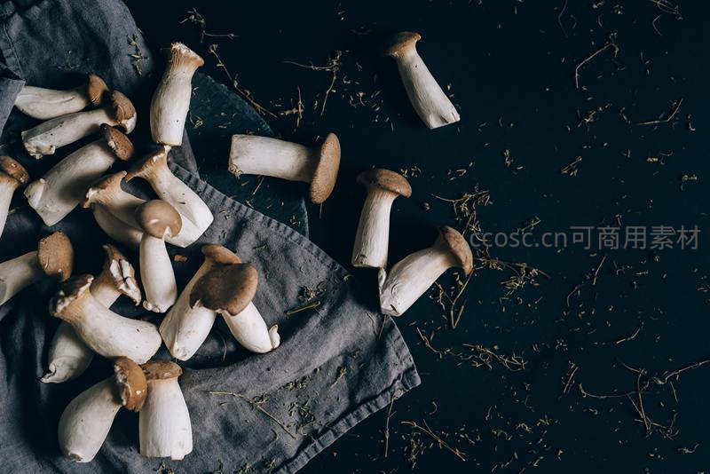 杏鲍菇与干香草散落在深色台面与布料上,构图留白,突出主体,色调沉稳,适合用于食谱封面或高端餐饮视觉设计。