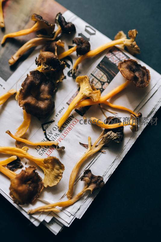 黄色鸡油菌干品陈列,报纸背景复古文艺
