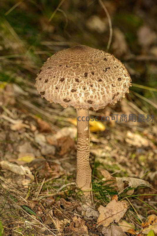一朵布满深色鳞片的大型蘑菇从铺满干枯落叶的林地上探出,粗壮的菌柄支撑着宽大的菌盖,尽显野性之美。