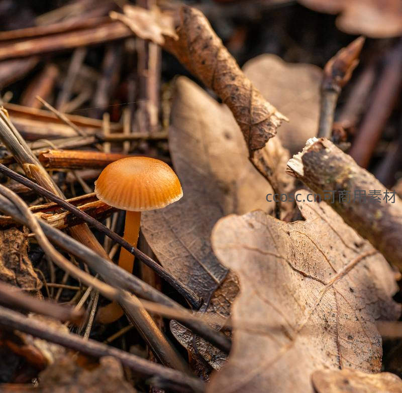 在层层叠叠的棕色枯叶与细枝间,一株娇小的橙色蘑菇悄然破土而出,为萧瑟的秋日林地增添了一抹亮色生机。