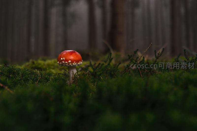 在幽暗森林的苔藓地上,一朵鲜艳的红白毒蝇伞亭亭玉立,背景是模糊的树干,营造出神秘而宁静的自然氛围。