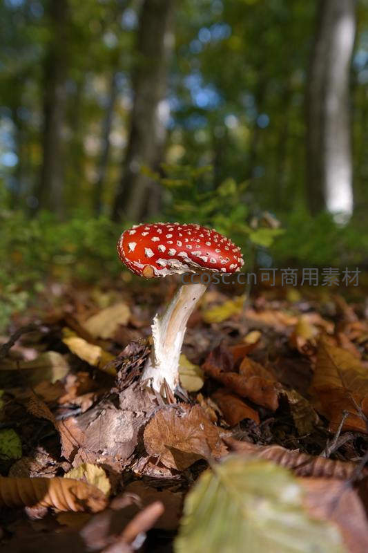 镜头聚焦于一朵生长在枯黄落叶堆中的毒蝇伞,其鲜红菌盖上布满白色斑点,在柔和的阳光下显得格外醒目,充满季节感。