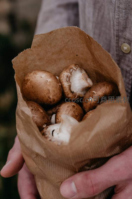 一位身着素色衬衫的人轻握纸袋,袋中香菇圆润饱满,背景虚化突出主体,传递出回归自然、享受原生态食材的生活理念。