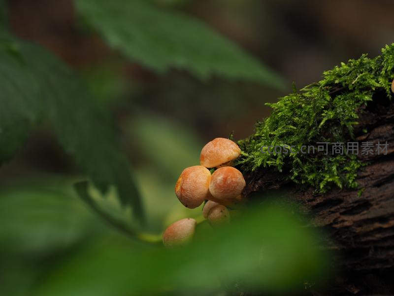 在湿润的森林中,几朵橙色的小蘑菇依偎在覆盖着翠绿苔藓的树干上,展现了大自然静谧而充满生机的一面。