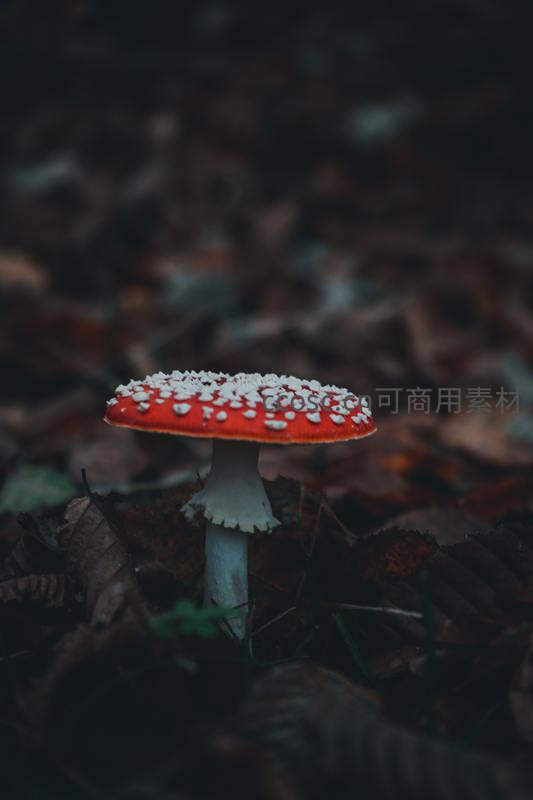 一朵经典的红顶白点毒蝇伞从深色落叶中探出,色彩鲜明如童话场景,是森林里神秘又美丽的自然造物。