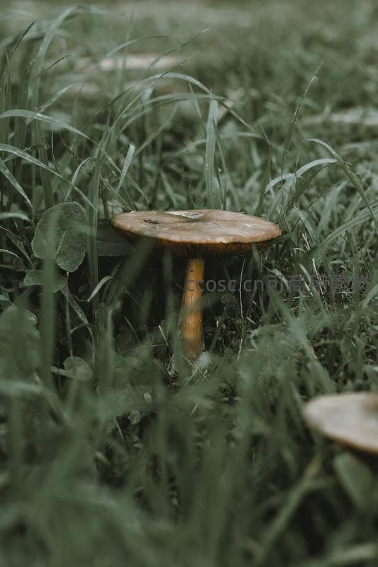 在一片青翠的草丛中,一朵蘑菇悄然挺立,周围草叶轻柔环绕,营造出一种静谧、孤独却充满生命力的氛围。