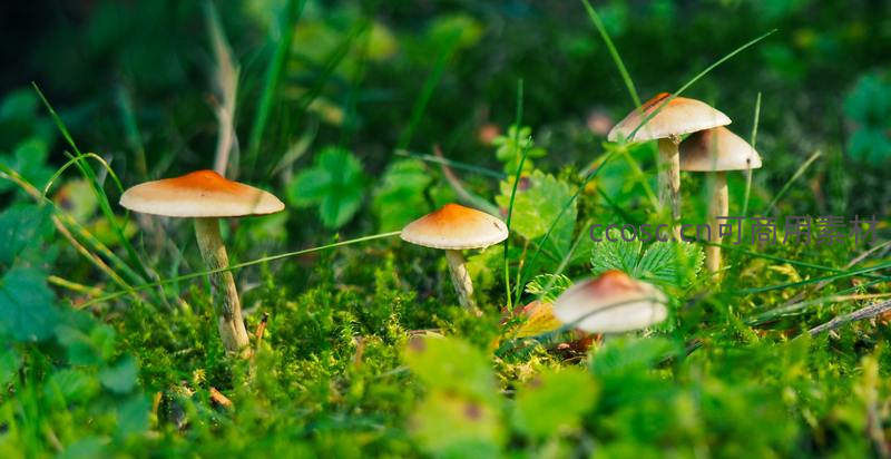 几朵橙色菌盖的蘑菇散布在翠绿苔藓与草丛间,色彩鲜明对比强烈,阳光下显得格外鲜活,仿佛童话中的精灵居所。