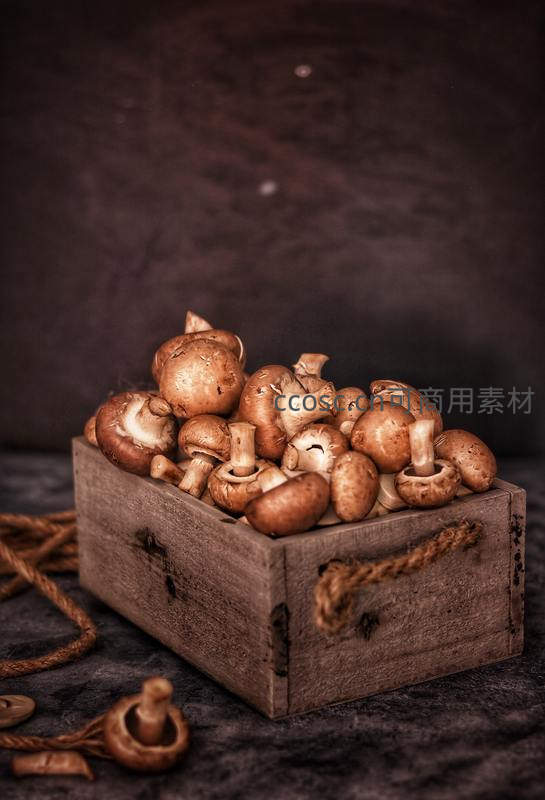 一个质朴的木箱堆满饱满的新鲜香菇,背景深沉,暖色调灯光勾勒出菌盖纹理,传递出丰收的喜悦与厨房的温馨气息。
