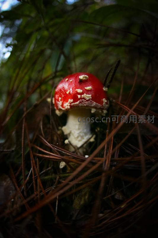 在幽暗的森林地表,一颗鲜艳的红顶白点毒蝇菌从枯叶与松针中探出,色彩鲜明,形态独特,充满神秘感。