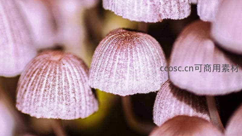 多枚粉紫色的小蘑菇紧密簇拥,菌盖表面布满清晰的放射状纹路,在柔和光线下展现出如丝绸般的细腻质感与梦幻色彩。