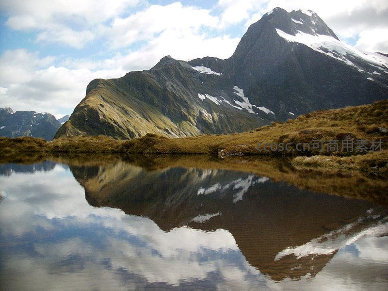平静如镜的湖面完美倒映着连绵山峦与飘动云朵,近处草甸与远处雪峰相映成趣,呈现天地合一的和谐意境。