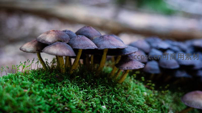 深紫色的蘑菇群落生长在翠绿苔藓之上,色彩对比鲜明,营造出幽深森林中神秘而静谧的微观世界。
