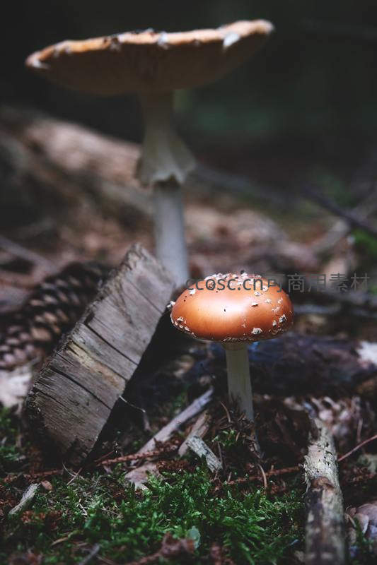 一颗鲜艳的橙色蘑菇从腐朽的木头旁探出,周围散落着松针与枯枝,展现了森林生态系统中生命与衰败共存的奇妙景象。