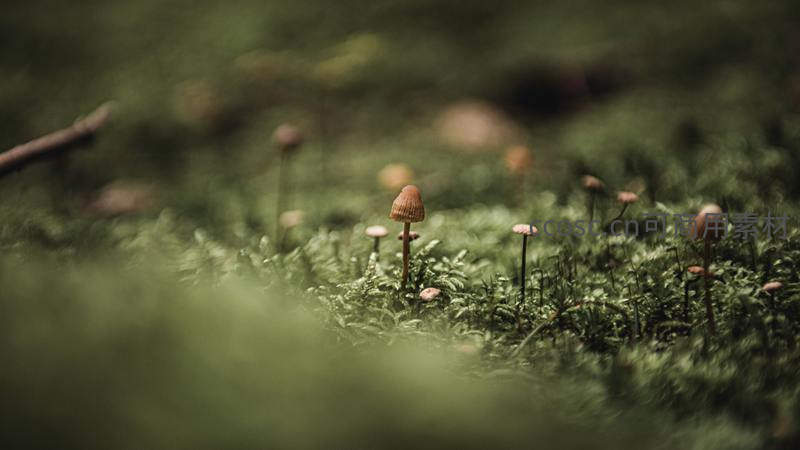 无数细小的蘑菇如童话中的精灵般点缀在翠绿的苔藓地毯上,柔和的焦外虚化让整个画面充满梦幻与生机。
