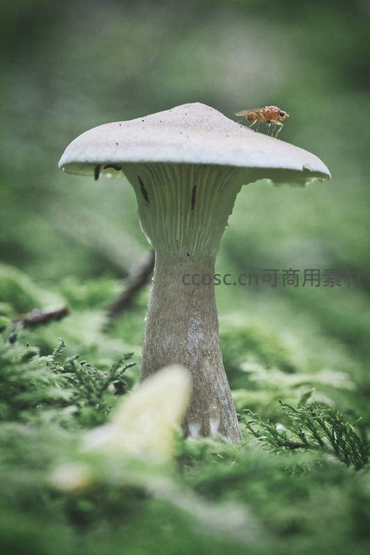 一只微小的昆虫停驻在巨大蘑菇的伞盖边缘,展示了微观世界中生物间的微妙互动,以及自然生态的丰富细节。
