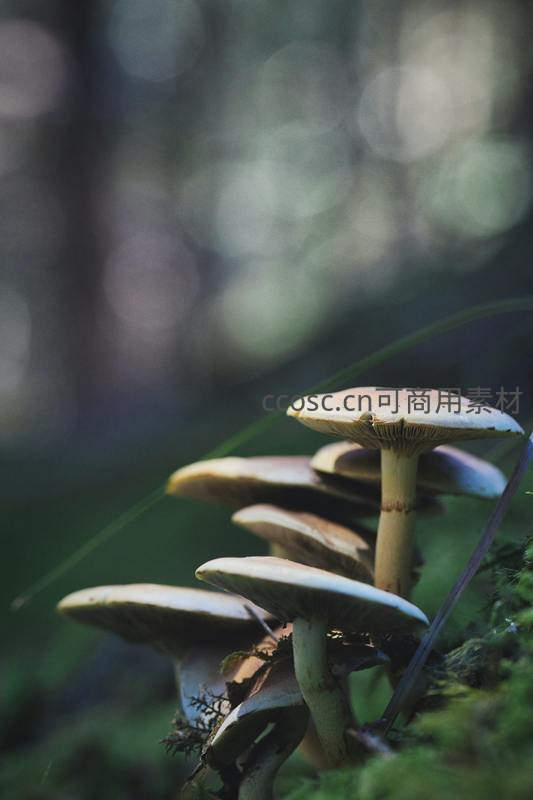 一丛洁白的蘑菇在林下悄然生长,柔和的光线透过树叶洒落,背景的光斑为这宁静的画面增添了一丝诗意与温暖。