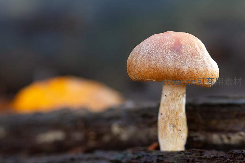 一朵饱满的棕色伞菌独自挺立于朽木之上,背景虚化中透出另一抹暖色,突显其在幽暗林地中的孤寂与坚韧的生命力。