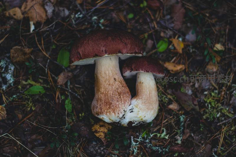 两株粗壮的牛肝菌根部相连,共同从铺满松针与落叶的林地土壤中长出,展现了真菌在自然环境中相互依存、共同繁衍的奇妙景象。
