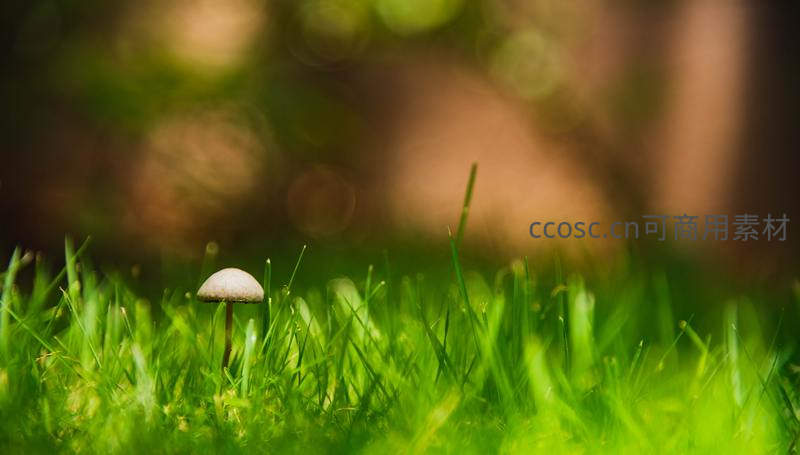一颗小小的蘑菇从鲜绿的草丛中探出头来,背景是温暖柔和的焦外虚化光斑,整个画面充满了春天的活力与宁静美好的自然气息。