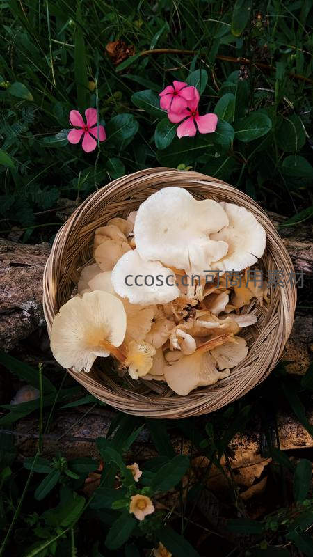 一个手工编织的竹篮里装满了刚采摘的白色平菇,背景是绿叶和盛开的粉色花朵,展现了田园生活的质朴与丰盛。