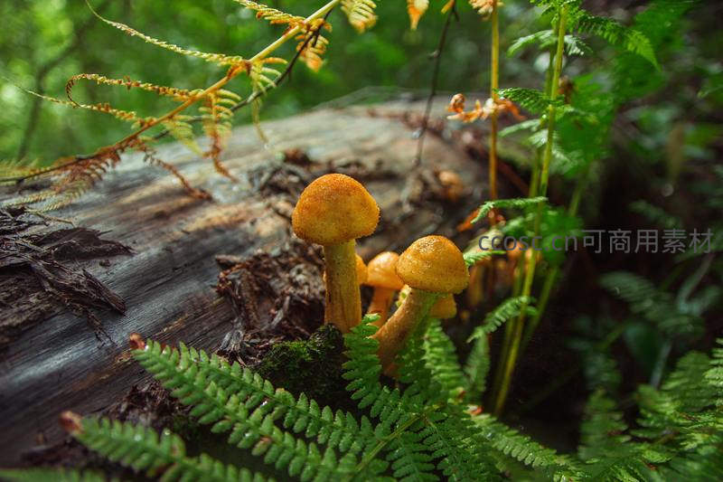 几株鲜亮橙色蘑菇从朽木缝隙中冒出,四周环绕着湿润的翠绿蕨叶,晨露未干,生动呈现雨后森林中生命的蓬勃与复苏。