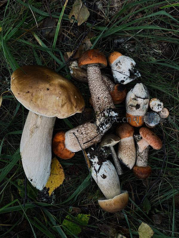 在绿草与落叶之间,多种形态各异的野生蘑菇自然生长,菌盖饱满,菌柄粗壮,展现了大自然的丰饶与静谧之美。