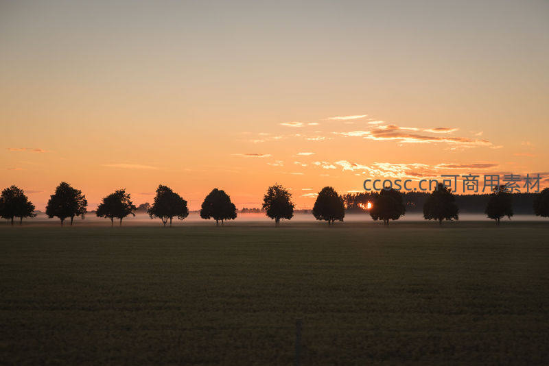 金色朝阳从地平线缓缓升起,薄雾轻笼广袤田野,一排排树木剪影勾勒出诗意天际,营造出安详而温暖的清晨氛围。