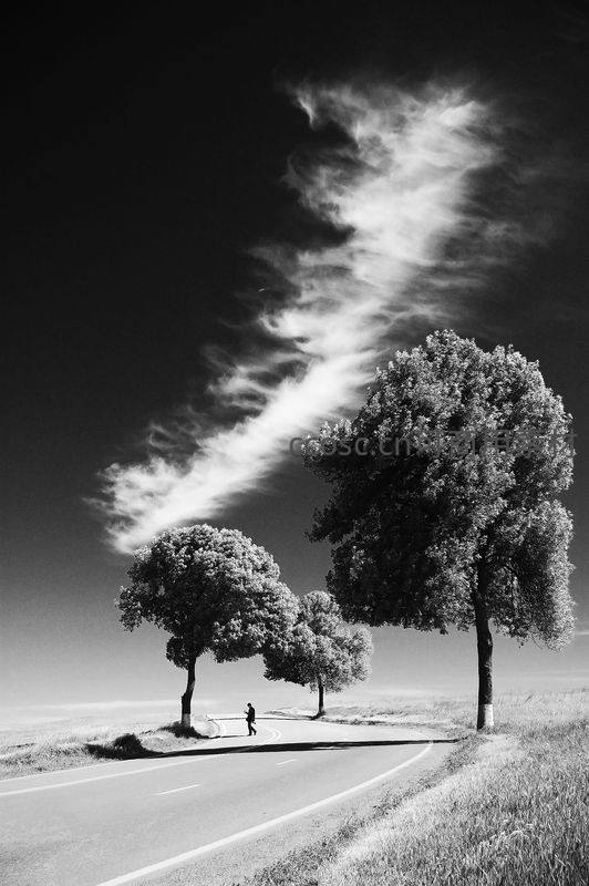 一条蜿蜒公路旁,一人独行于树影之下,流动的云朵与深邃天空形成强烈对比,赋予画面戏剧性与哲学般的沉思意境。