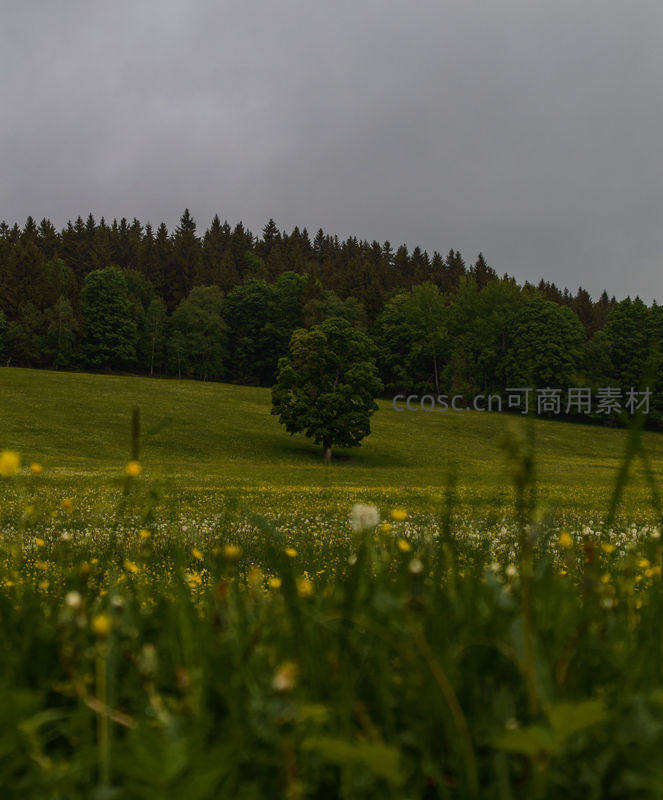 一片翠绿的草地上,一棵孤树静静伫立,背景是浓密的森林和灰暗的天空,营造出一种宁静而略带忧郁的氛围。