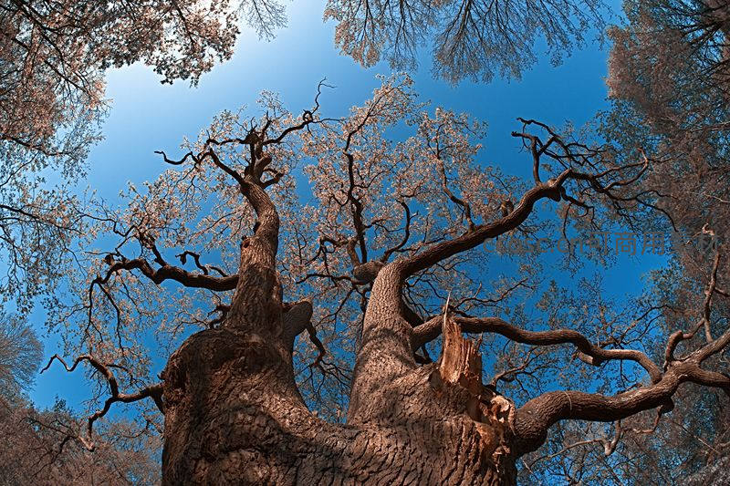 从低角度仰视,粗壮的树干和盘旋的枝桠直指湛蓝的天空,展现出古树历经岁月洗礼的雄浑力量与自然之美。