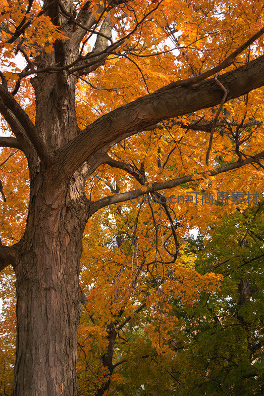 一棵苍劲的古树在深秋时节披上金装,满树橙黄叶片在微风中摇曳,如同燃烧的火焰,展现出季节更迭的壮丽与生命的辉煌。