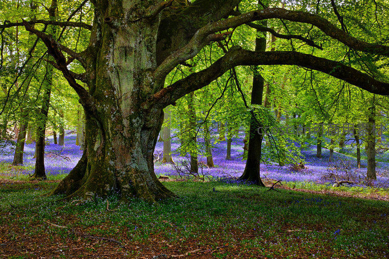 参天古橡树根植于紫色蓝铃花海之中,枝叶繁茂如华盖,阳光透过林隙洒落,整片森林弥漫着春日的梦幻色彩与勃勃生机。