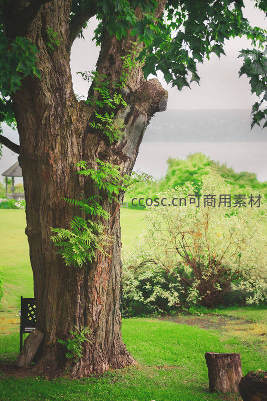 一棵苍劲的古树盘踞在公园草坪上,枝叶繁茂,远处是平静的湖面和朦胧的山峦,构成一幅宁静祥和的自然休憩图景。